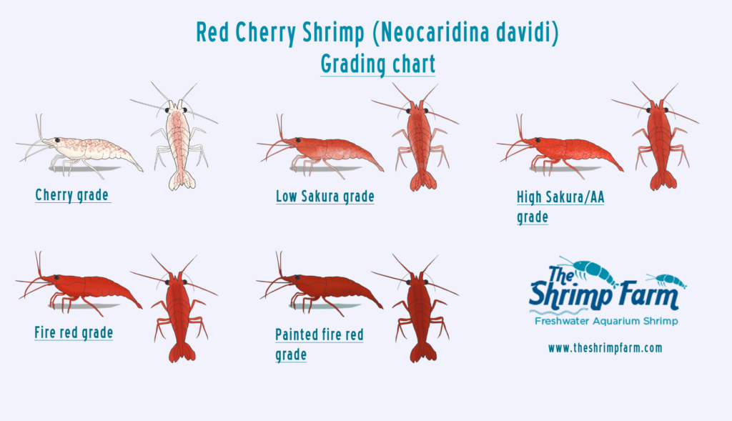 Os camarões Neocaridina davidii var. “Red”, têm várias “Grades”. Grade é a palavra inglesa que significa determinada cotação/rank, qualidade ou valor, que surgiu de forma a que nos seja possível referir a camarões de qualidade superior ou inferior.