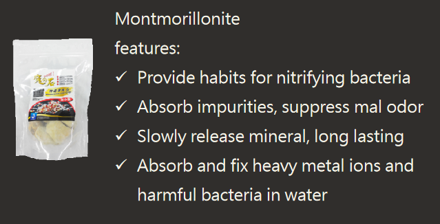 A argila montmorilonita também fornece minerais essenciais e oligoelementos para camarões, peixes e nitrobactérias. É altamente eficaz em realçar a cor dos camarões, aumentando a taxa de sobrevivência e estabilizando a água.